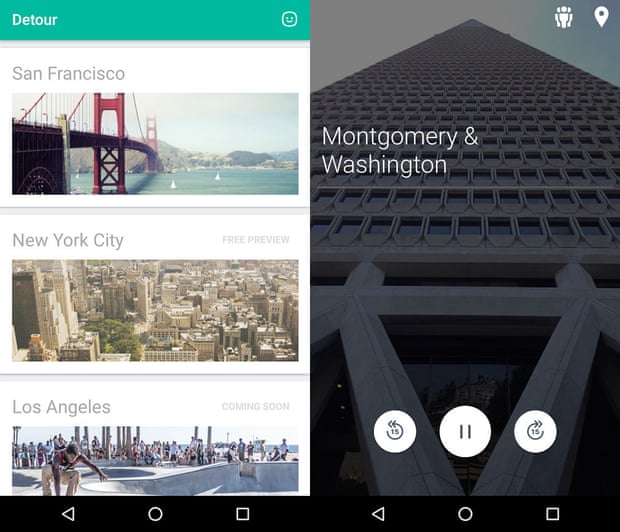 Beskikbaar op IOS vir 'n geruime tyd, Detour is nou op Android ook, en as jy lief is ronddwaal buitelandse stede, is dit 'n verrassing. Die app bied 'n reeks van klank gelei vlakke, aanvanklik vir San Francisco met New York City, Austin, Londen, Parys, Berlyn, Barcelona, en Marrakech ook ondersteun.